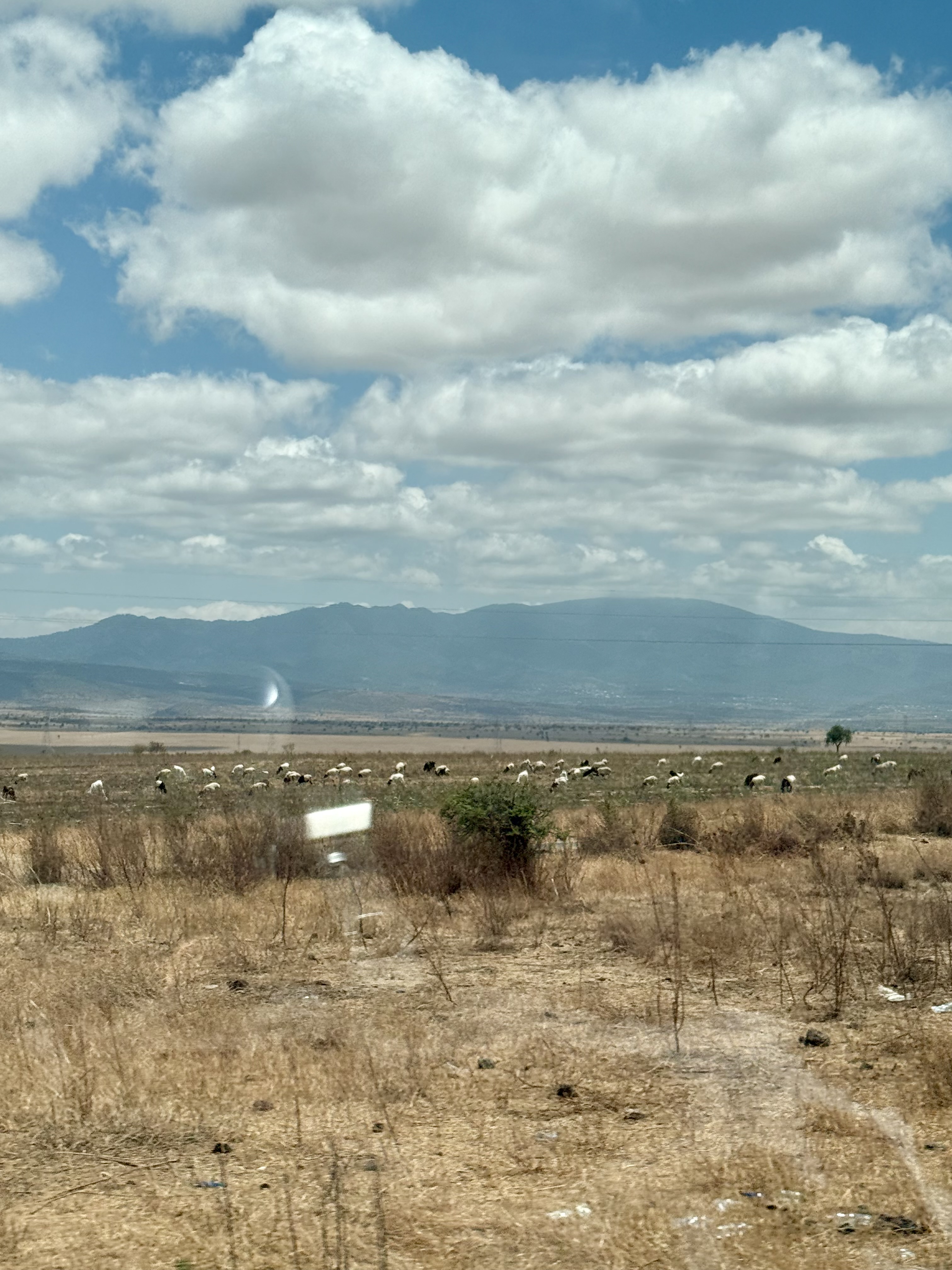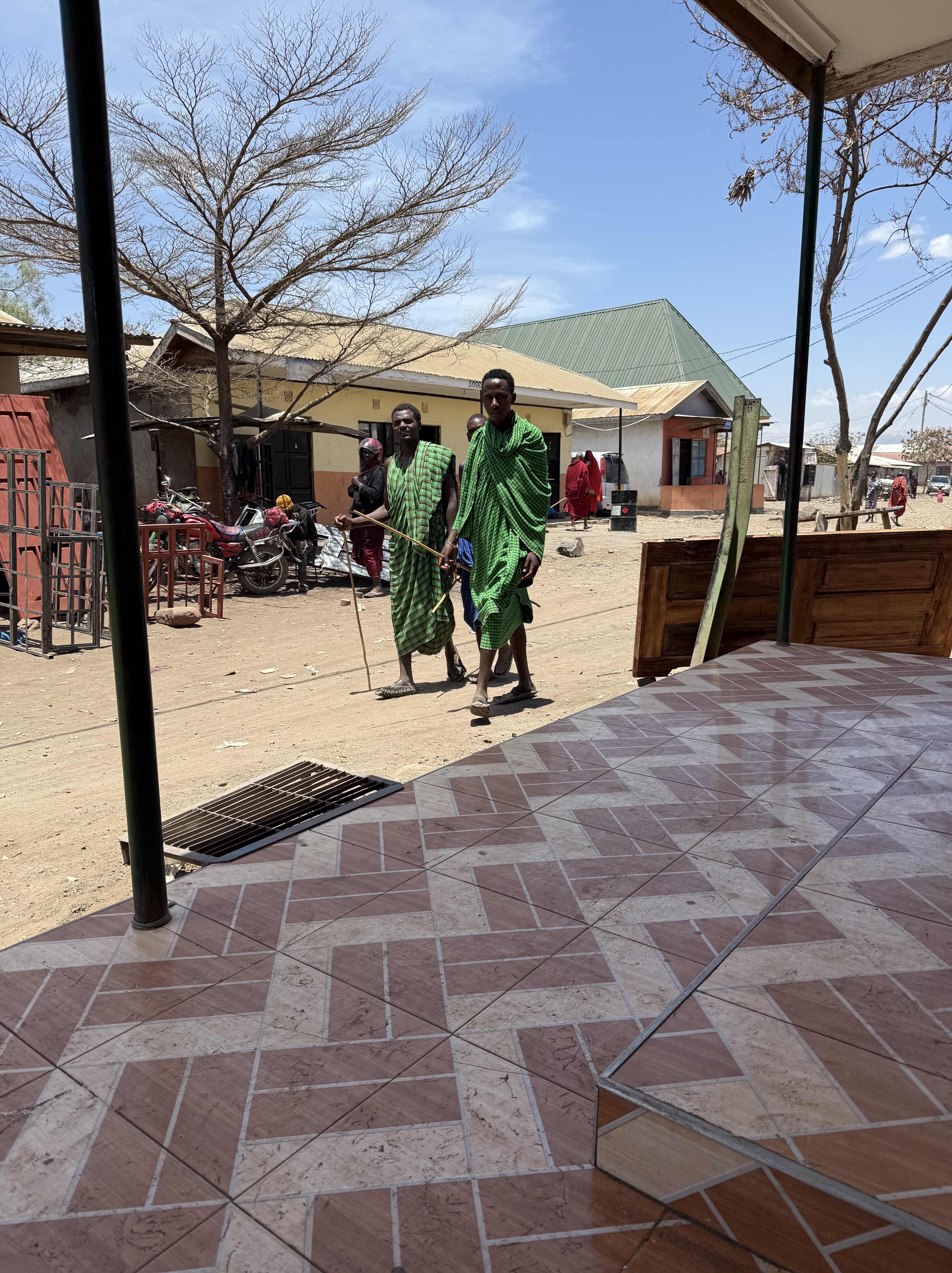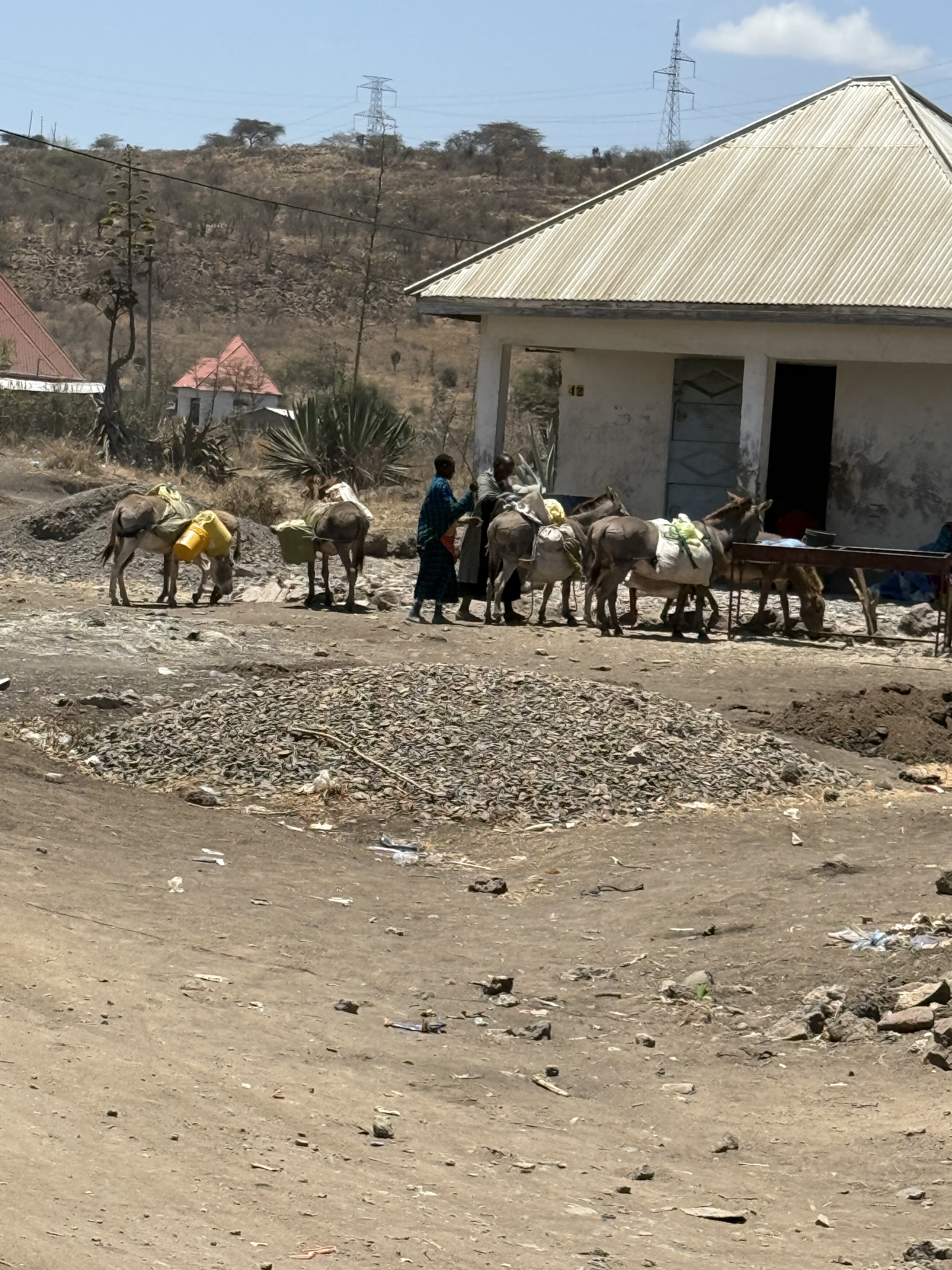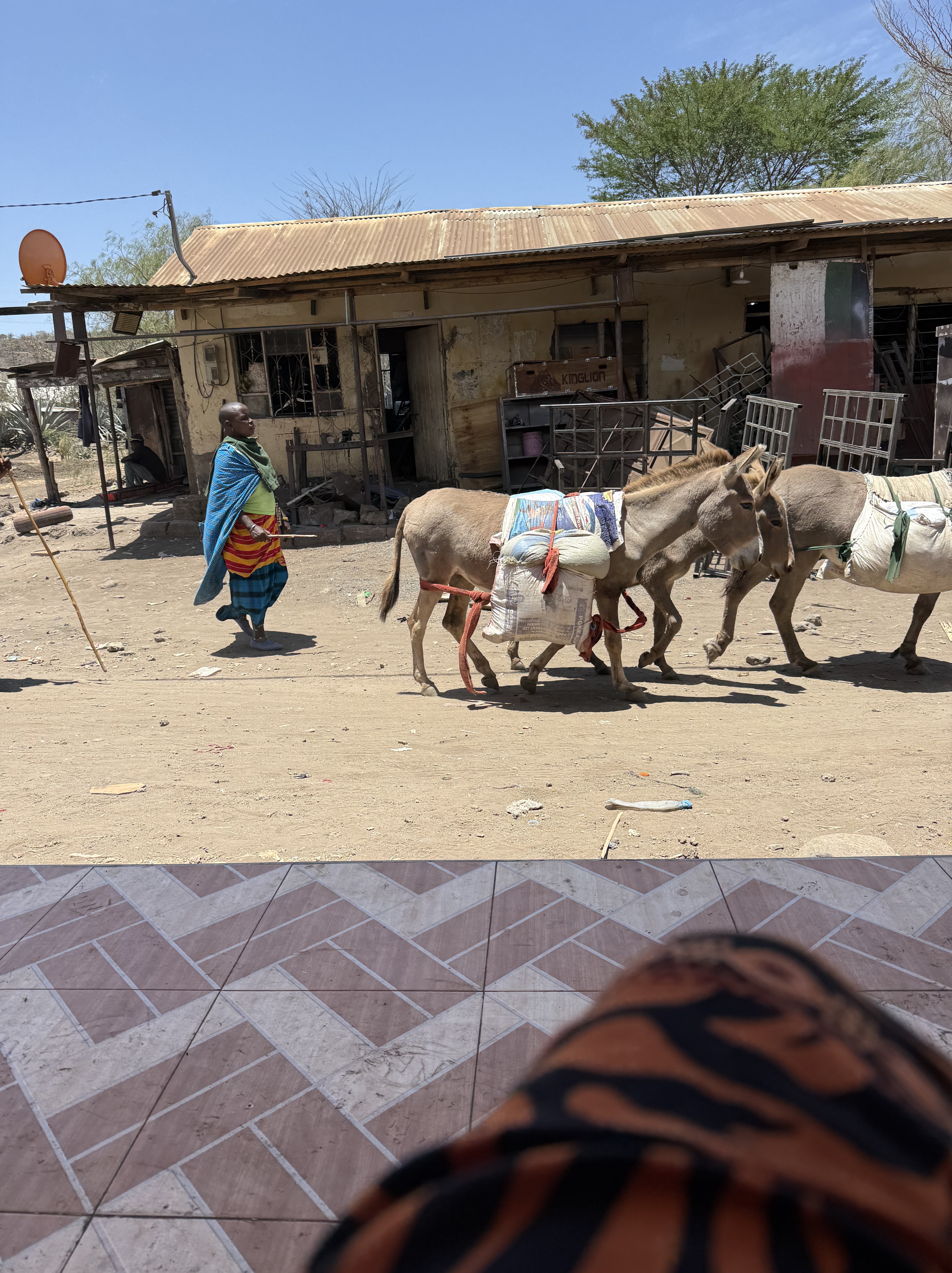 You see so many different things as you drive along the road here! I see a lot of donkeys who seem to be wandering by themselves sometimes, but you also see them hauling water jugs. It is very dry here as the rainy season has not yet begun (although it did rain at my place the other night which brings unwelcome critters: baby mosquitoes). Because it is so dry, the people and animals have to walk a long way to get water, so they bring the donkeys to carry many jugs which will last them longer. Some walk up to and over ten miles one way to find water! I always see flocks of sheep, goats, and cattle on my drives. I wish I could take better pictures of them, but I’m in a moving vehicle on an iPhone, lol. The Maasai love bright colors, so their clothes really stand out against the dry, dusty land. It’s really exactly how you would imagine their ancestors looked one thousand years ago, but then you see them riding on a piki-piki (motorcycle) in their Maasai clothes talking on a cell phone, and you remember it is 2025.