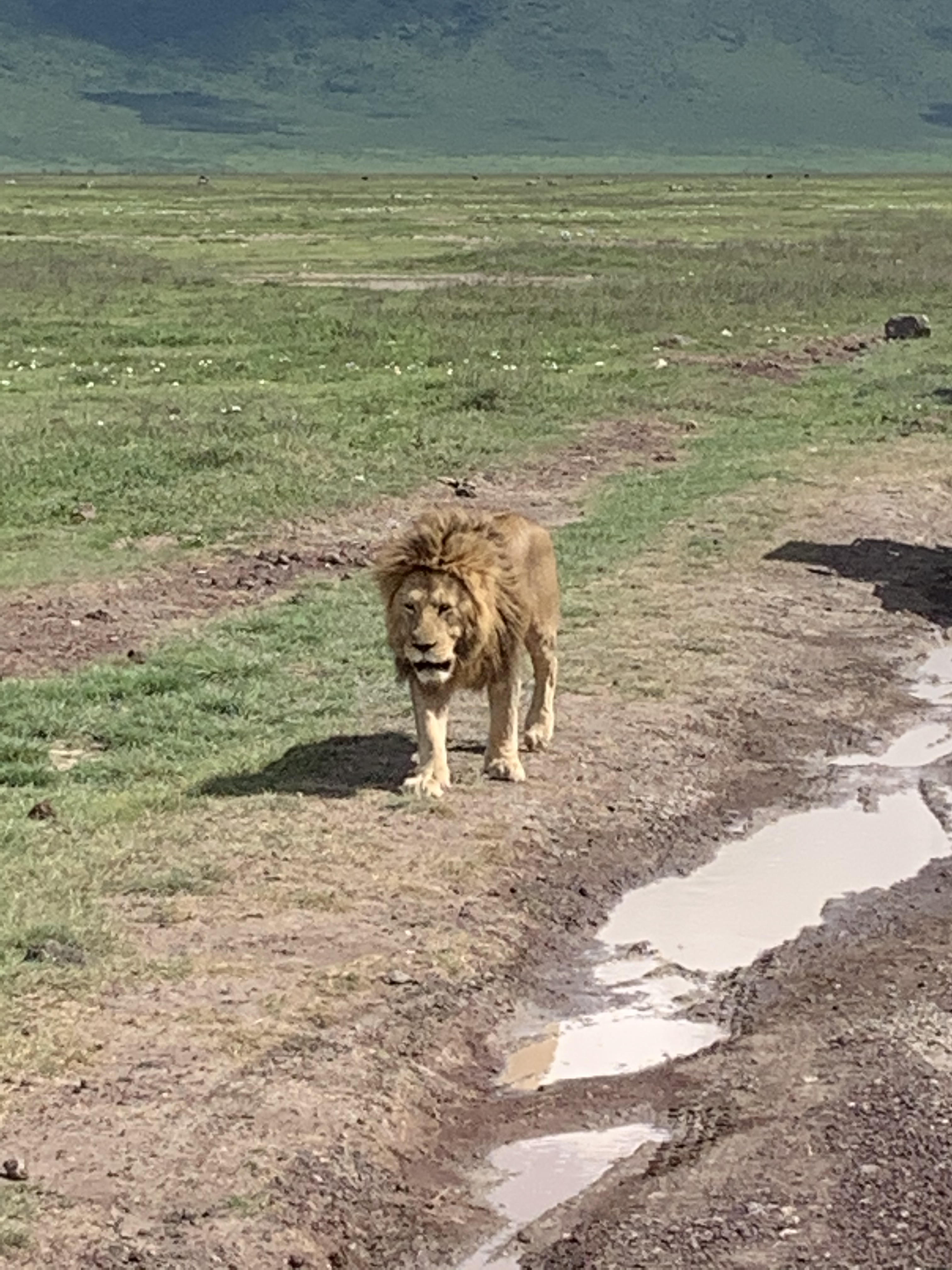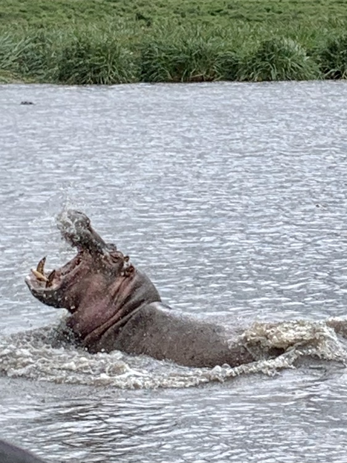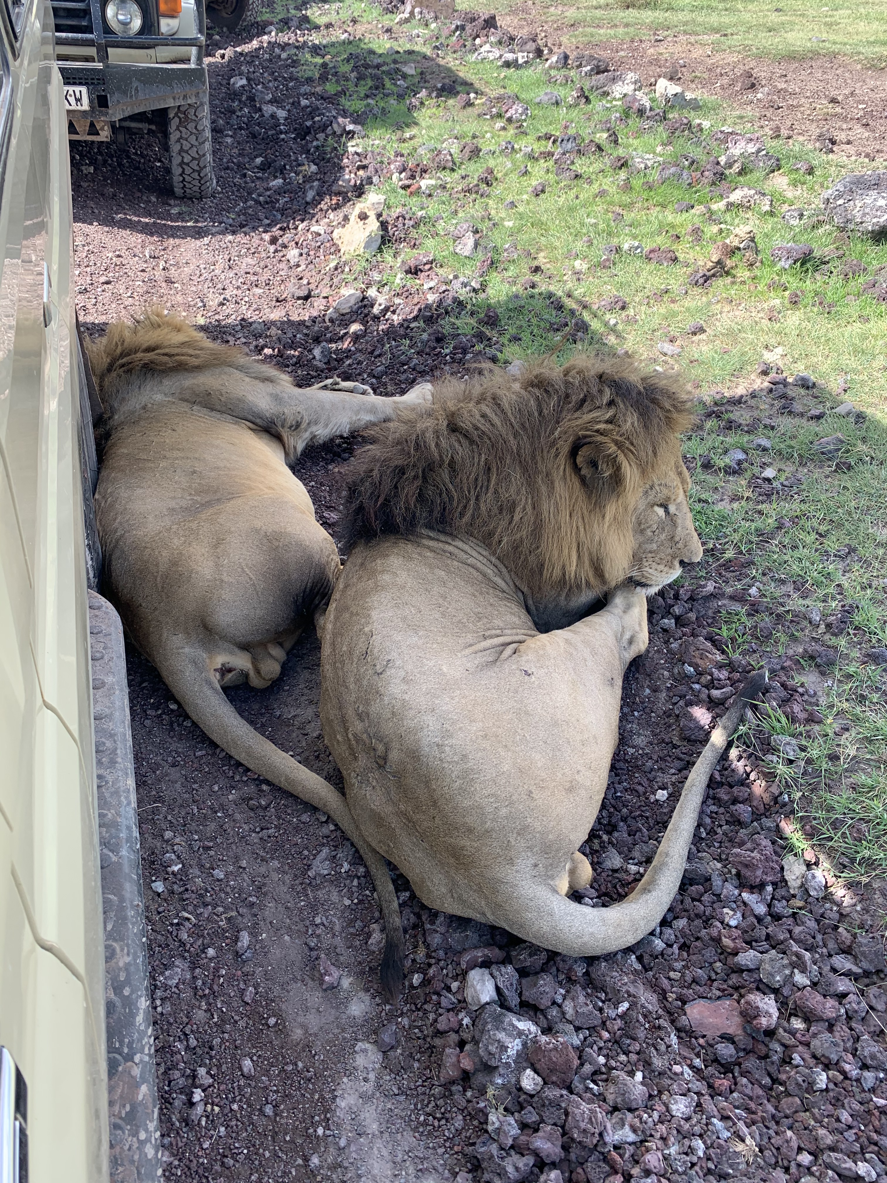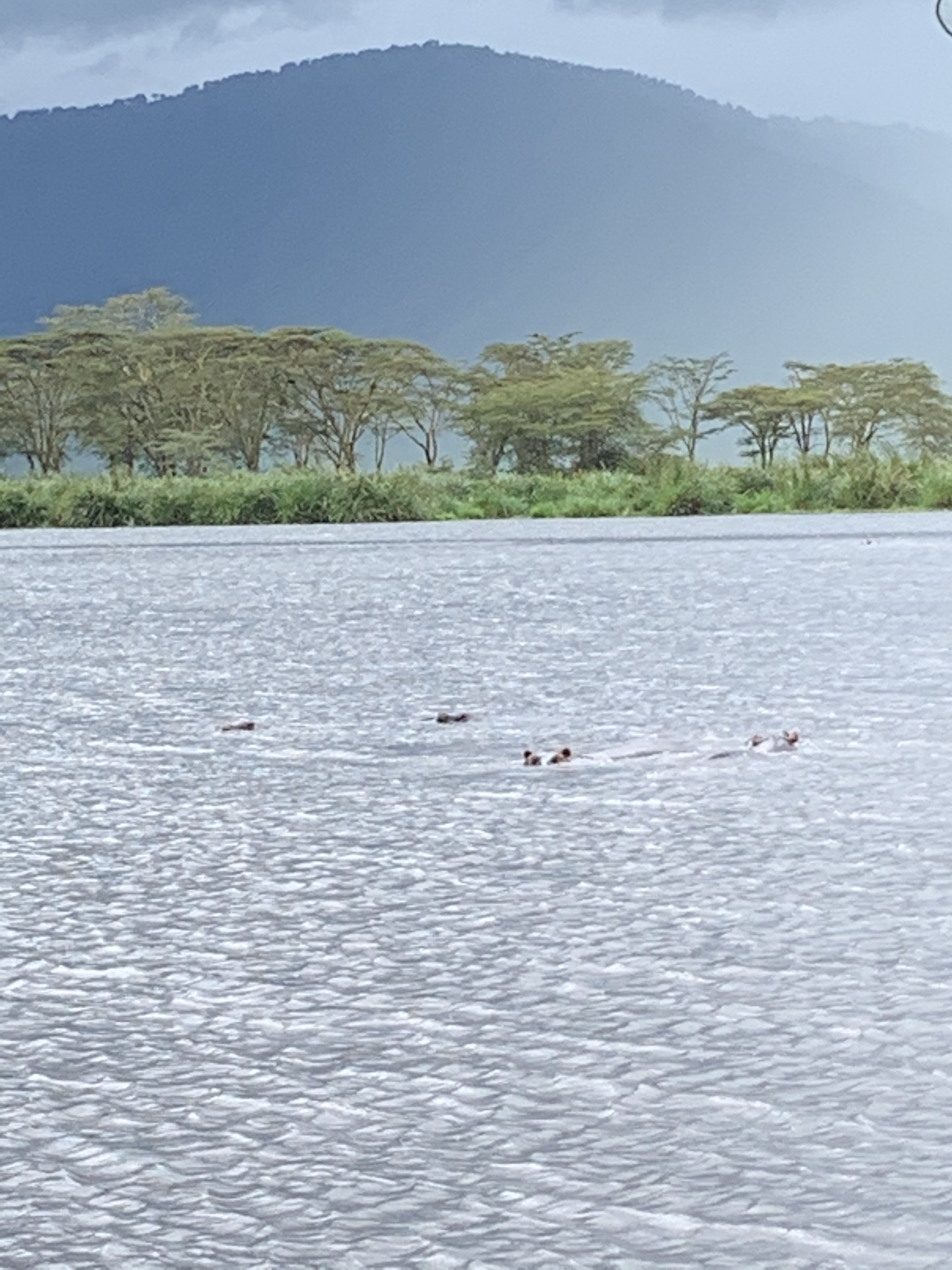 One year I was able to visit Ngorongoro Crater which is the world’s largest volcanic caldera and is located in part of the famous Rift Valley. To get into the crater, you have to drive up and up the mountainside (hoping to see a gorilla or two) and then down into the crater. Inside the crater, you can find all five of the “Big Five” here: lions, leopards, elephants, Cape buffalo, and rhinos! I have seen all five, but I really don’t consider the rhino because we saw him, but he was so far away that I don’t really consider it a true sighting. That day we saw so many animals, but the coolest thing that happened to us was two male lions came and LAID DOWN RIGHT NEXT TO OUR VEHICLE to take a nap! My friend, Langoi, and his son (my godson), Loy, came with me that day. Loy was hanging out of the top and I was terrified that he was going to be a snack for these lions! But, man! What a cool experience! Another cool experience was eating lunch at the “HIppo Pool” and watching the hippos bob up and down in the water. On that trip, I was staying at a camp near Lake Manyara, and the hippos would come “visit” me every night. They would eat outside of my tent, and they are very loud eaters! We also had a wildebeest/zebra stampede through the middle of camp one night. You could hear the animals racing up and down and then would hear the cries of the Maasai guards following them to steer them out of the camp.